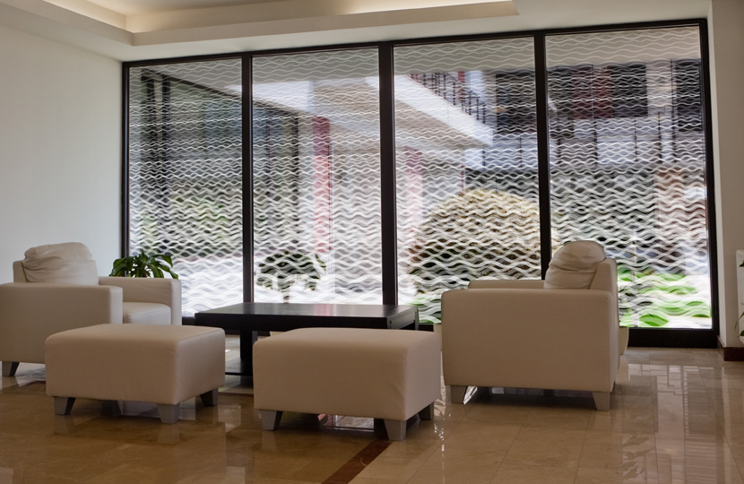 Inspired by the wave patterns in water, this design provides moderate privacy blocking in a quiet distraction pattern.